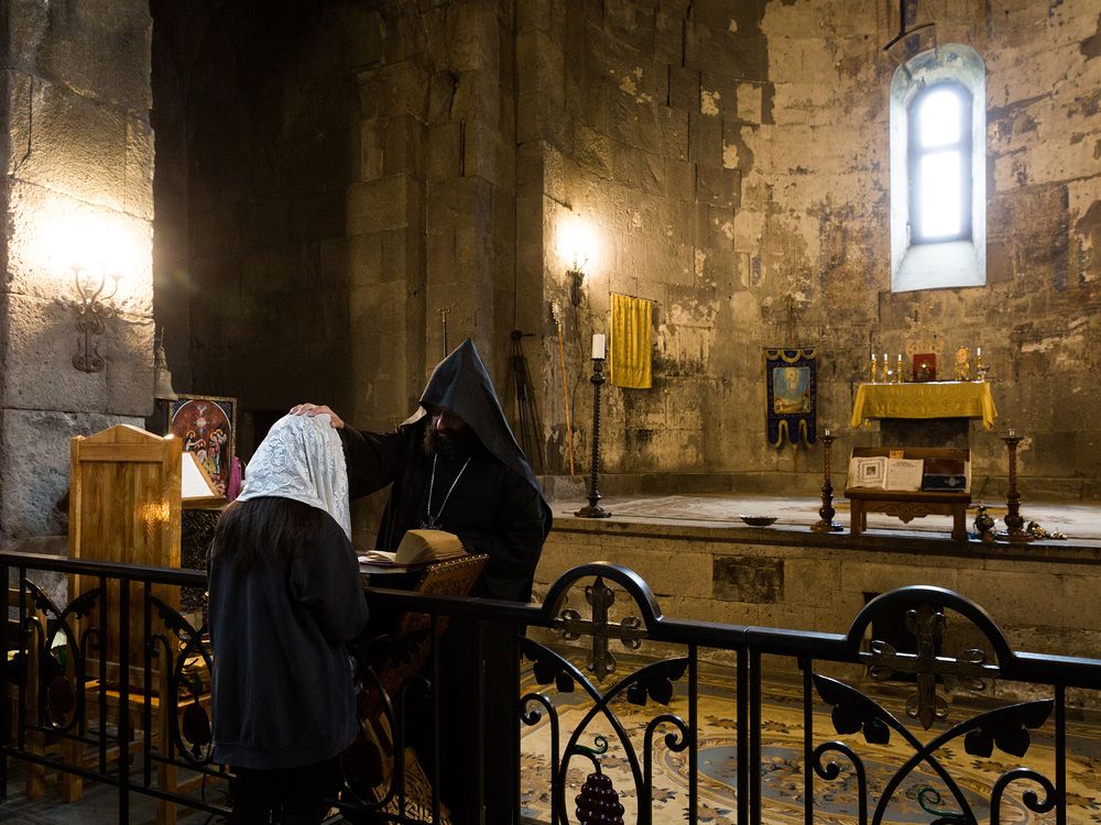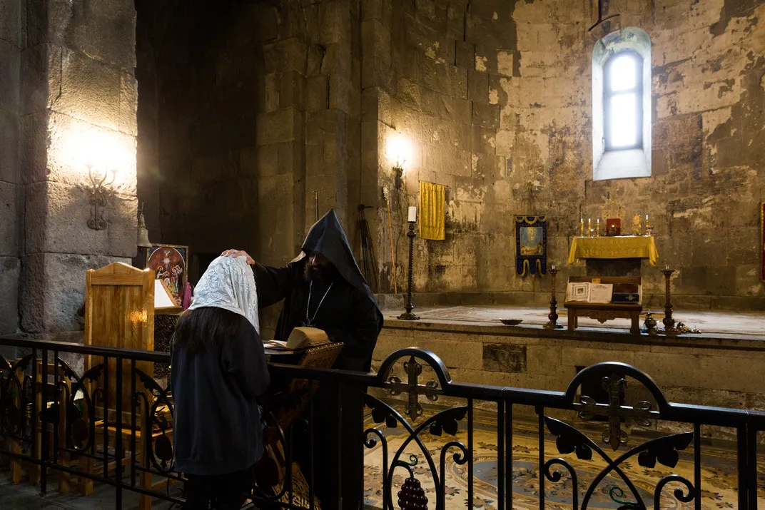 Inside the ancient Tatev Monastery in southern Armenia, a priest gently places his hand on a woman’s head during a blessing. The dim light, the scent of wax, and the sound of whispered prayers reveal a moment of profound faith. An encounter between past and present that transcends language and time.