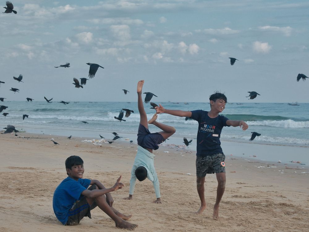 Three friends embrace the freedom of childhood—one lost in thought, one mid-cartwheel, one dancing with the waves—while crows swirl overhead on a lively beach morning.