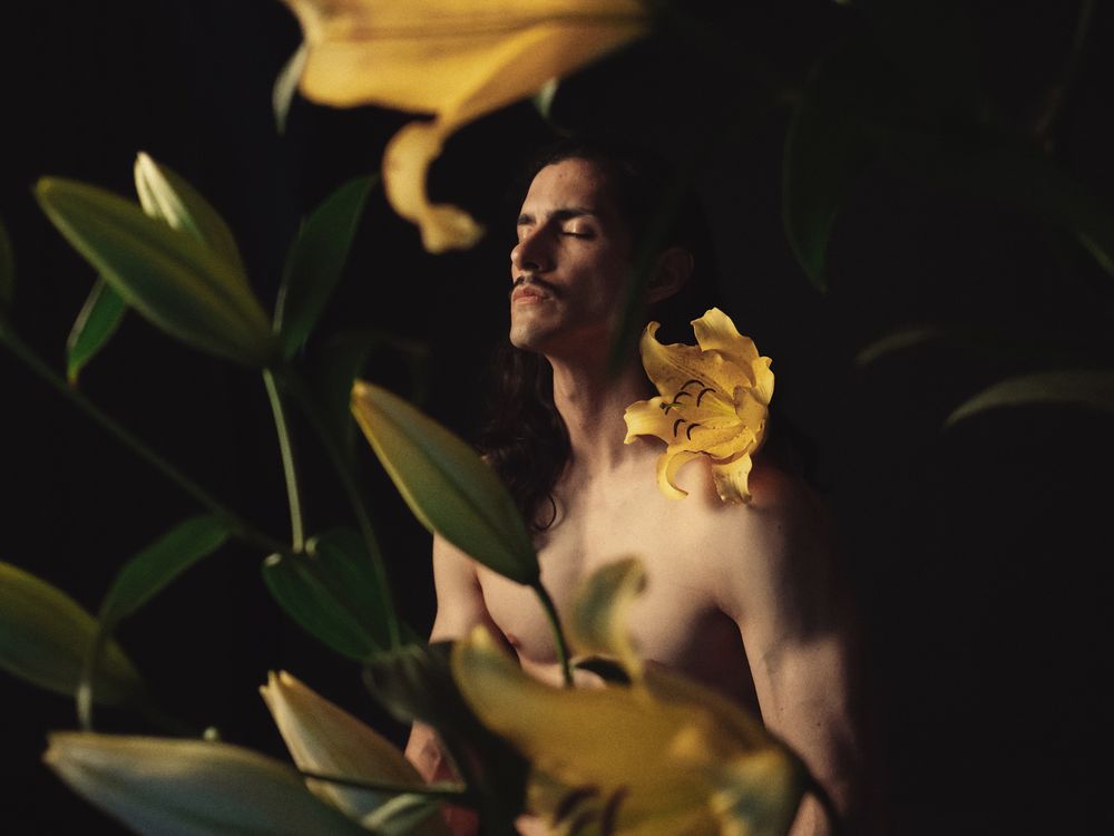 A masculine man surrounded by yellow flowers. The contrast between his strong body and the flowers - tenderness and nature. Their beautiful connection.