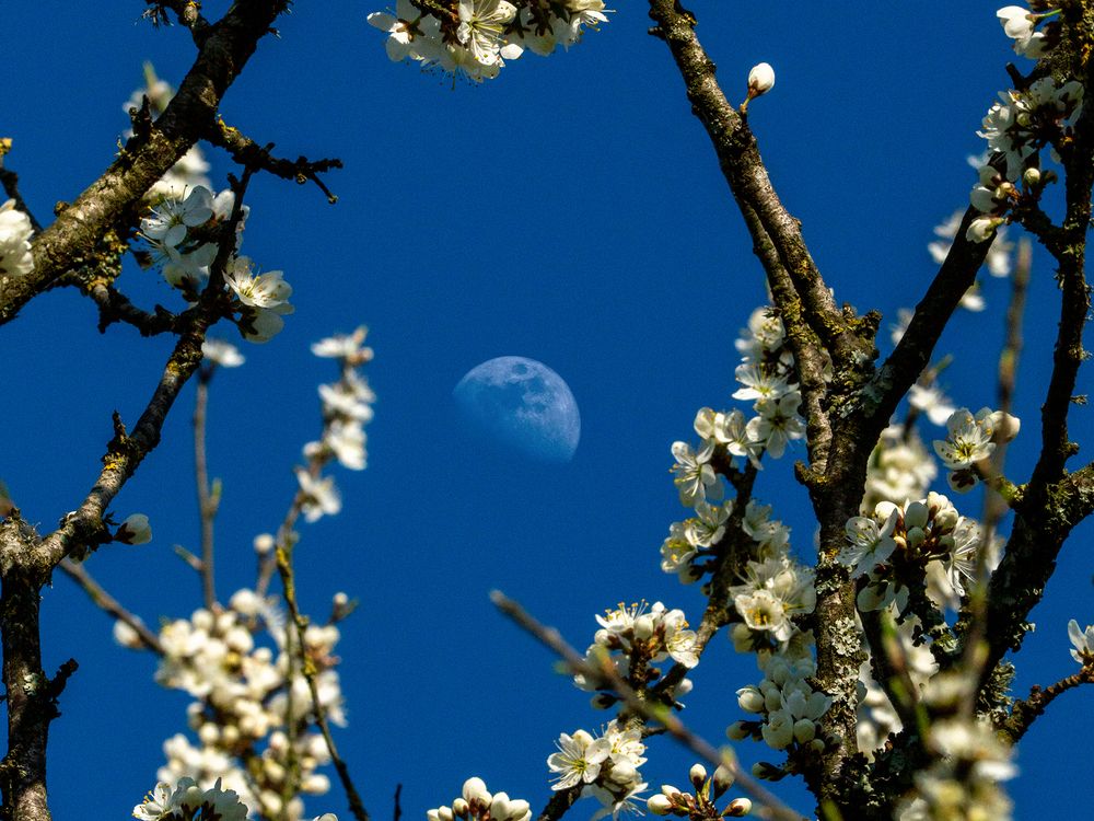 A serene half-moon lingers in a clear blue sky, gently framed by blooming branches dusted with white flowers. The scene feels suspended between two worlds — the quiet vastness of the heavens and the tender awakening of spring. It’s as if the moon pauses to listen to the blossoms, their fragile petals whispering a fairy tale carried by the wind. This image captures a fleeting harmony between celestial calm and earthly bloom, a delicate reminder that beauty often appears when nature and sky breathe in unison.