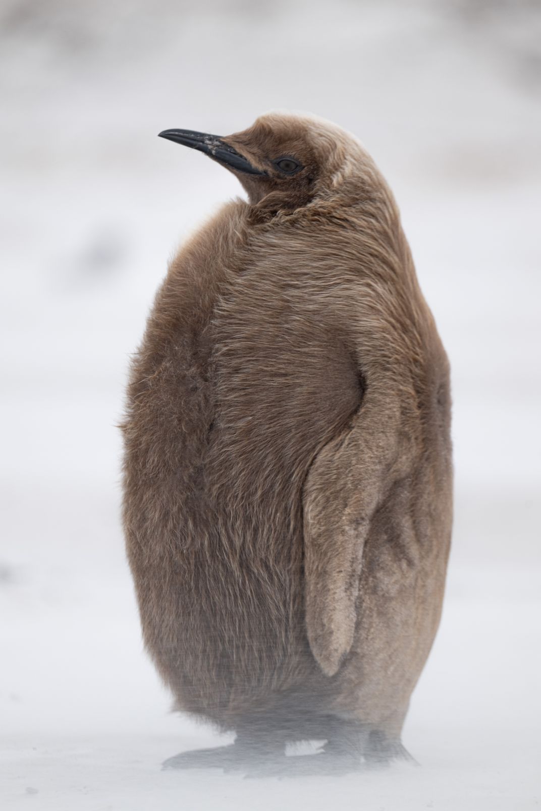 Young king penguin stand stoic in the sandstorm, plumage ruffled into a blowdry set with sand