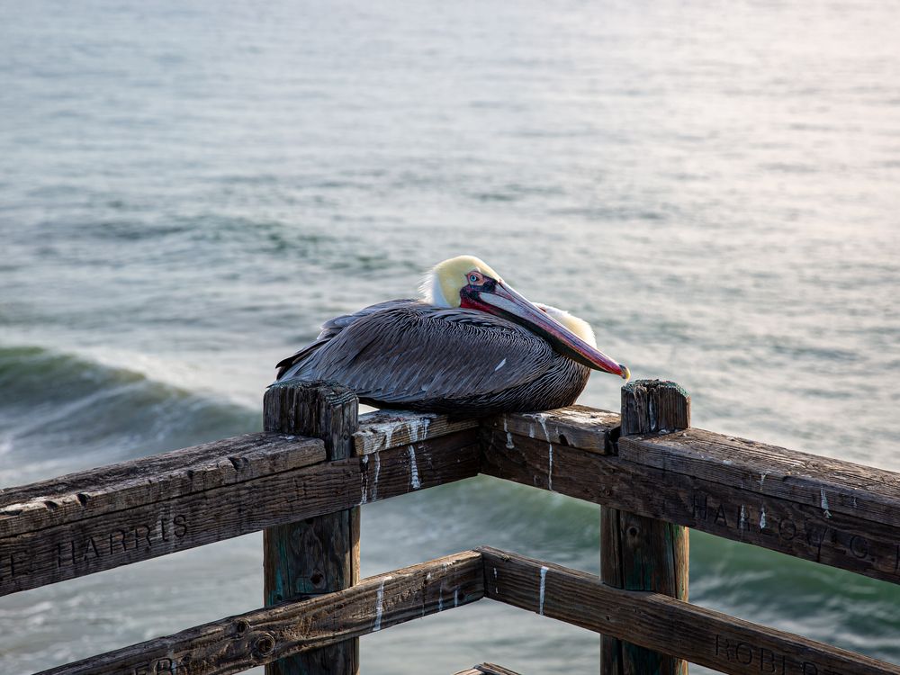 The California Brown Pelican - one of three species found in the Americas - rests on top of the ledge at Oceanside Pier, San Diego, CA during winter.