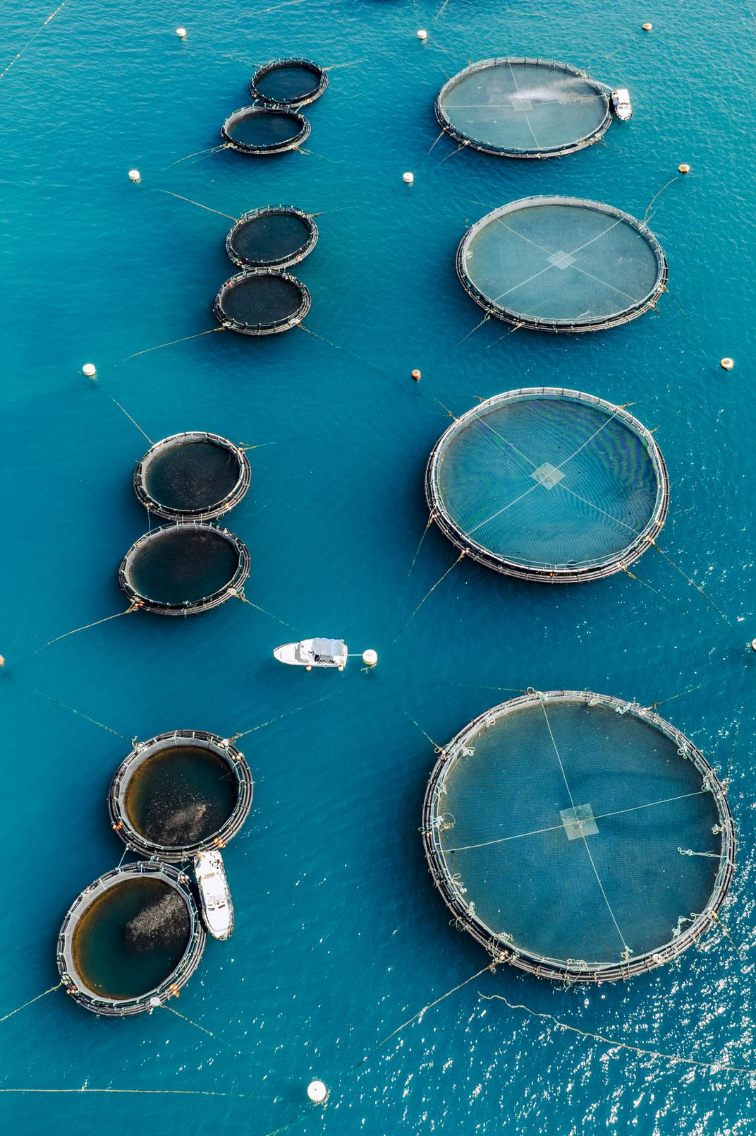 Circular tuna-farming enclosures float on pristine Mediterranean waters. These geometric structures reveal how modern aquaculture blends into—and sometimes contrasts with—the natural environment.