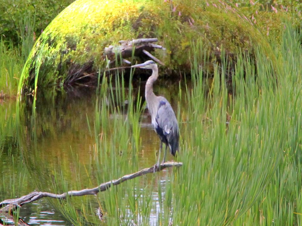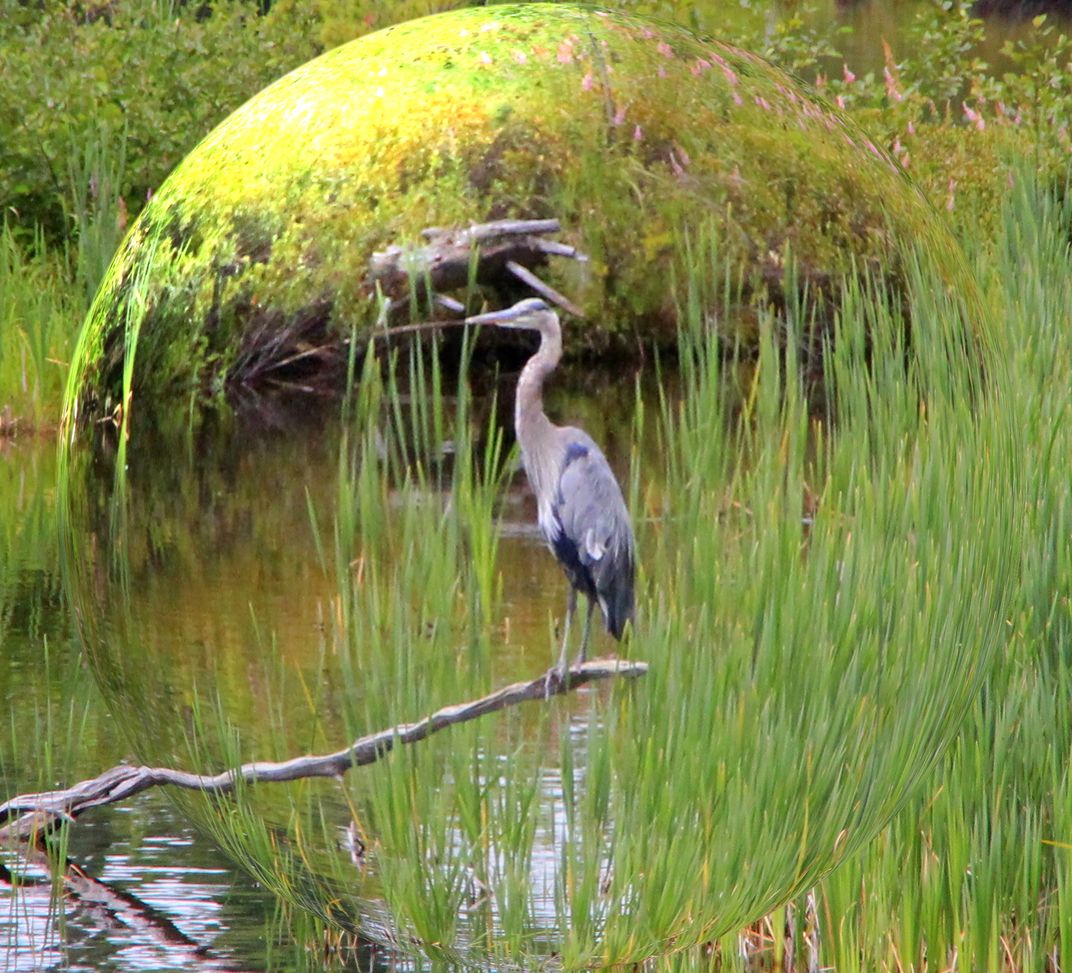 blue heron trapped in a globe