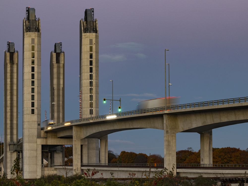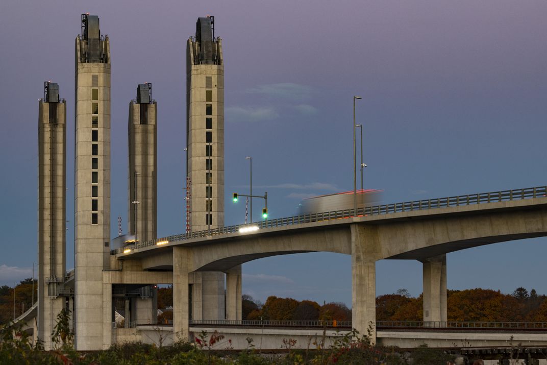 The Sarah Mildred Long lift bridge between Portsmouth, NH and Kittery, ME at twilight.