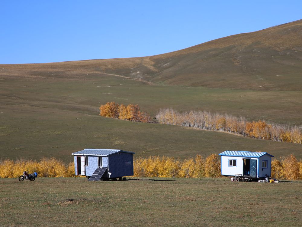 Two blue houses in Inner Mongolia's golden autumn grassland.