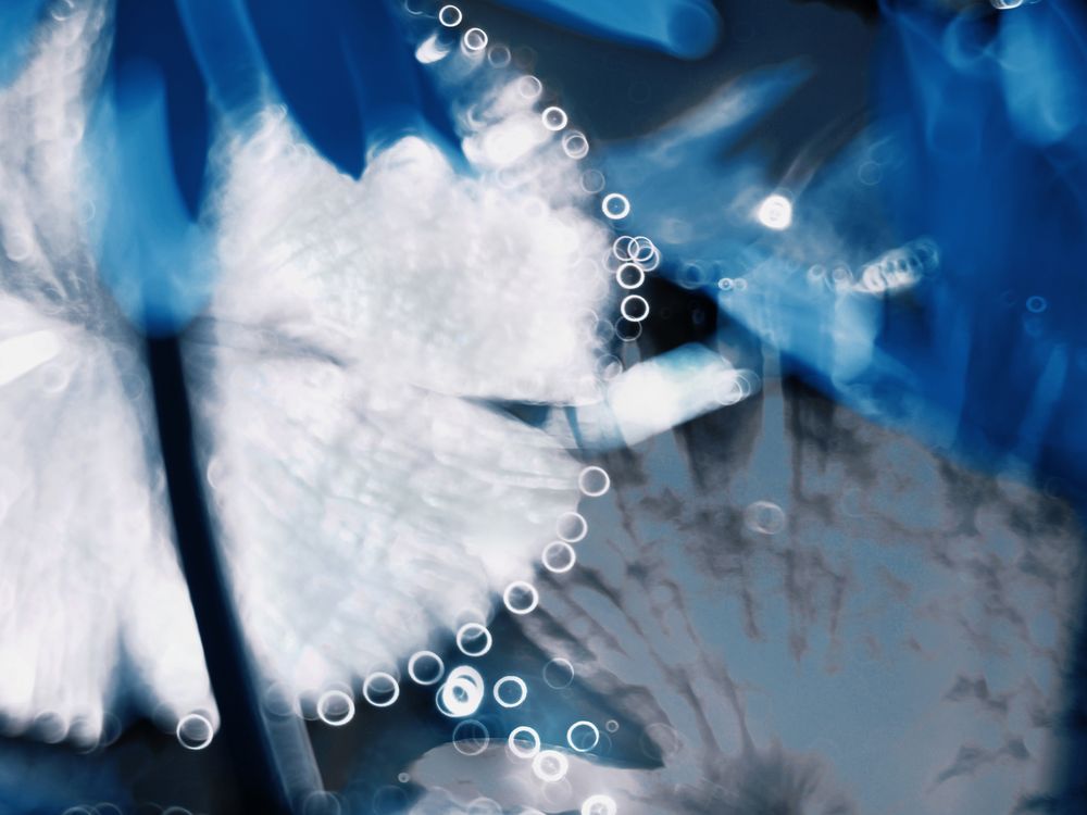 Indigo backgrounds cradle translucent petals, adorned with water droplets like scattered stars. The cool color palette exudes a serene Zen-like essence, resembling a frozen poem of water.
