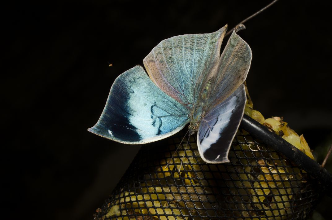The South Indian Blue Oakleaf Kallima horsfieldii is a butterfly that has mastered the art of camouflage. With its wings closed, it perfectly resembles a dry leaf. Only when it flies or basks in the sun, does it reveal its brilliant blues! Here, it is ready to take-off after a drink of overripe pineapple juice!