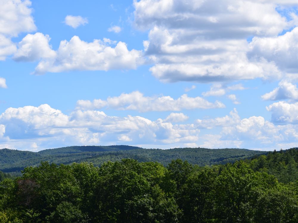 A beautiful Summer Day with bright blue skies, white fluffy clouds, and rolling hills of New Hampshire's Ragged Mountain.