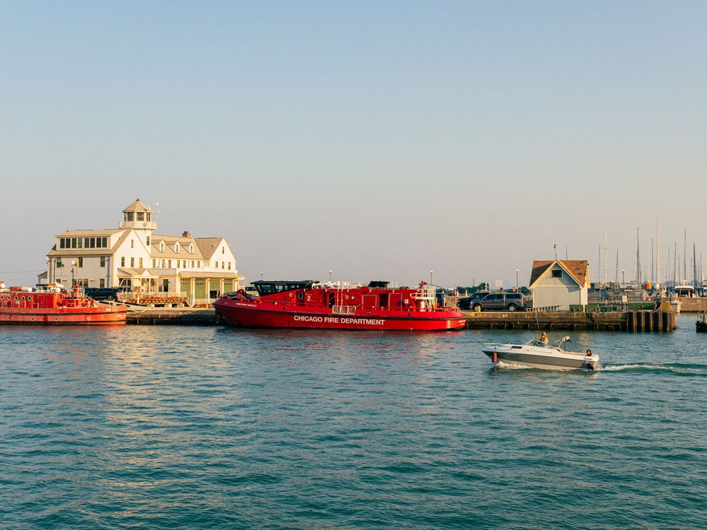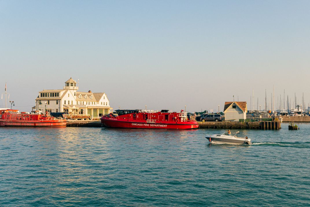 This photo was taken from the viewpoint of a tour boat on the Chicago River, highlighting other types of boats—such as one from the Chicago Fire Department.