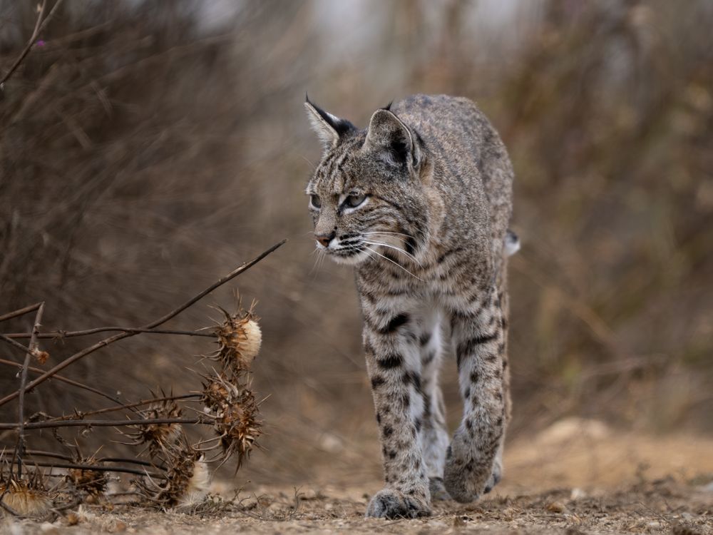A Bobcat walking along a dirt path next to a dry milkthistle. The bobcat is looking off to the left in the direction of an area of gopher burrows, hoping for some activity.