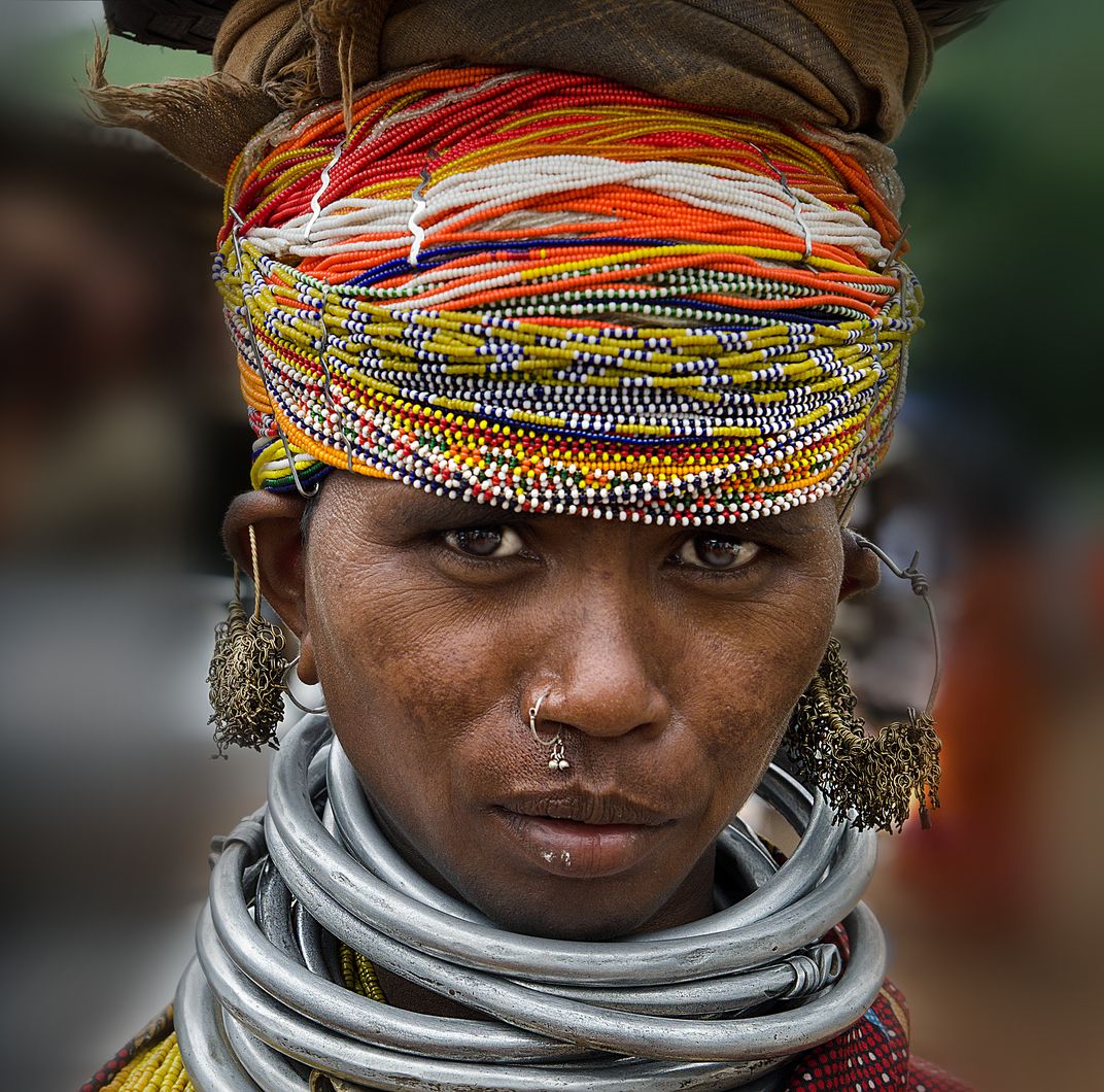 The Bonda (also known as the Bondo, Bondo Poraja, Bhonda, or Remo) are an ancient tribe of people numbering approximately 12,000 (2011 census) who live in the isolated hill regions of the Malkangiri district of southwestern Odisha, India, near the junction of the three states of Odisha, Chhattisgarh, and Andhra Pradesh The Bonda are generally semi-clothed, the women wear thick silver neck bands. The Bonda attire is explained in a legend relating to the Ramayana. According to it, some Bonda women chanced upon Sita who was bathing at a pond in the Bonda hills and, seeing her naked, they sniggered. Enraged, Sita cursed them to a life where they would be condemned to remaining naked and having their heads shaven. When the Bonda women pleaded forgiveness, Sita gave them a piece of cloth she tore off her sari. This explains, according to the legend, why Bonda women have shorn heads and wear only a ringa, a length of cloth that covers the waist. Their torsos are covered in strings of colourful beads. Bonda women also wear metal rings that cover their necks and bangles on their arms.