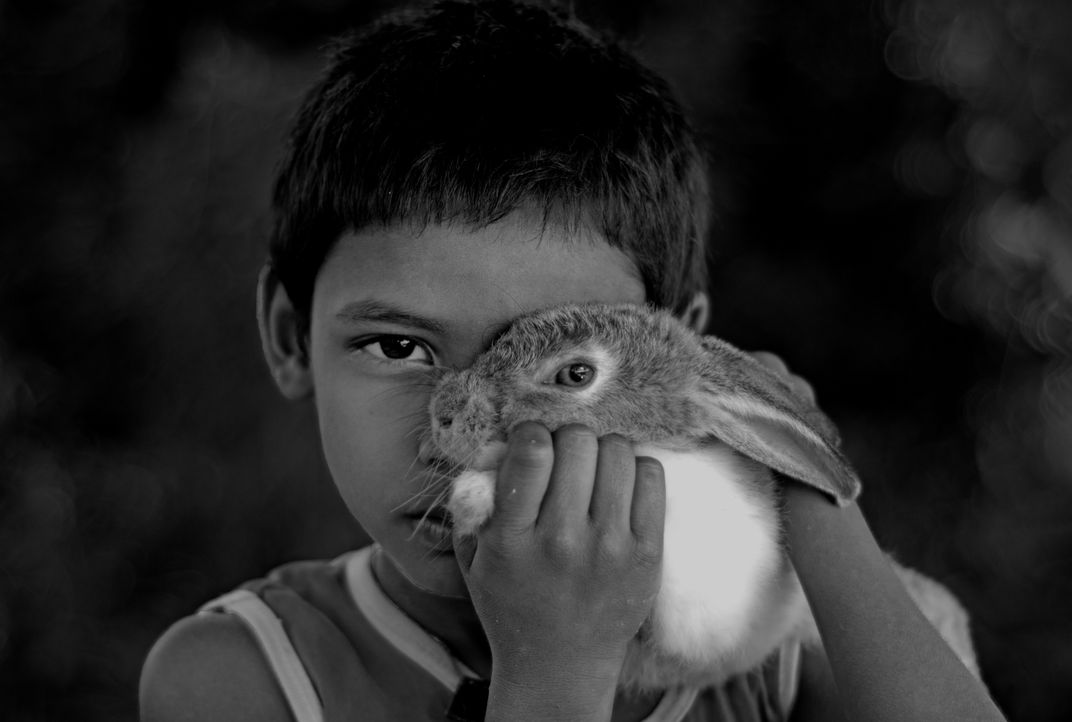 This image shows the bondage of an animal with a human being; a child is placing his pet rabbit's eye on his left eye to show their bondage.