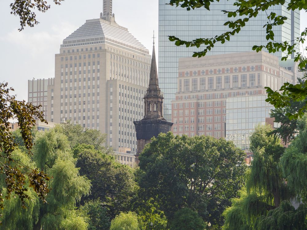 A view of the southeast end of the Boston Public Garden from across its lake. In the background rise skyscrapers with the Arlington Street Church in the center.