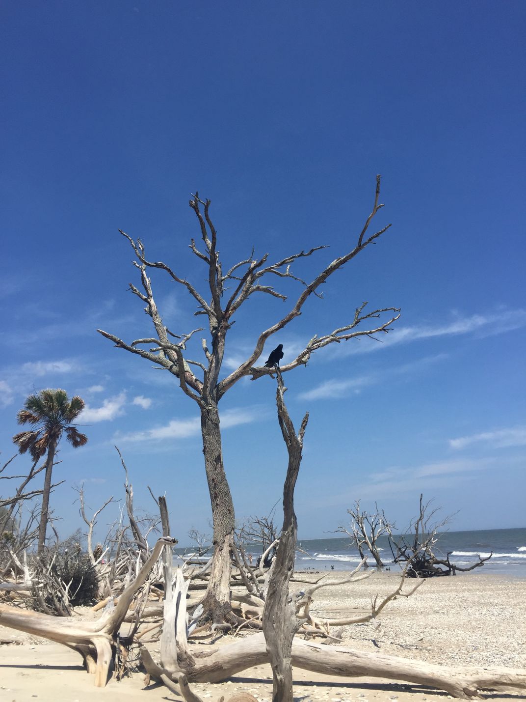 A lone blackbird sits on a bead tree in Botany Bay, SC