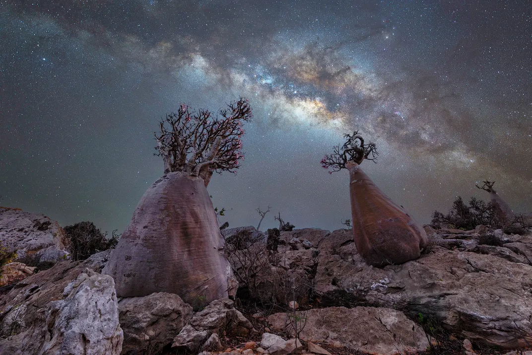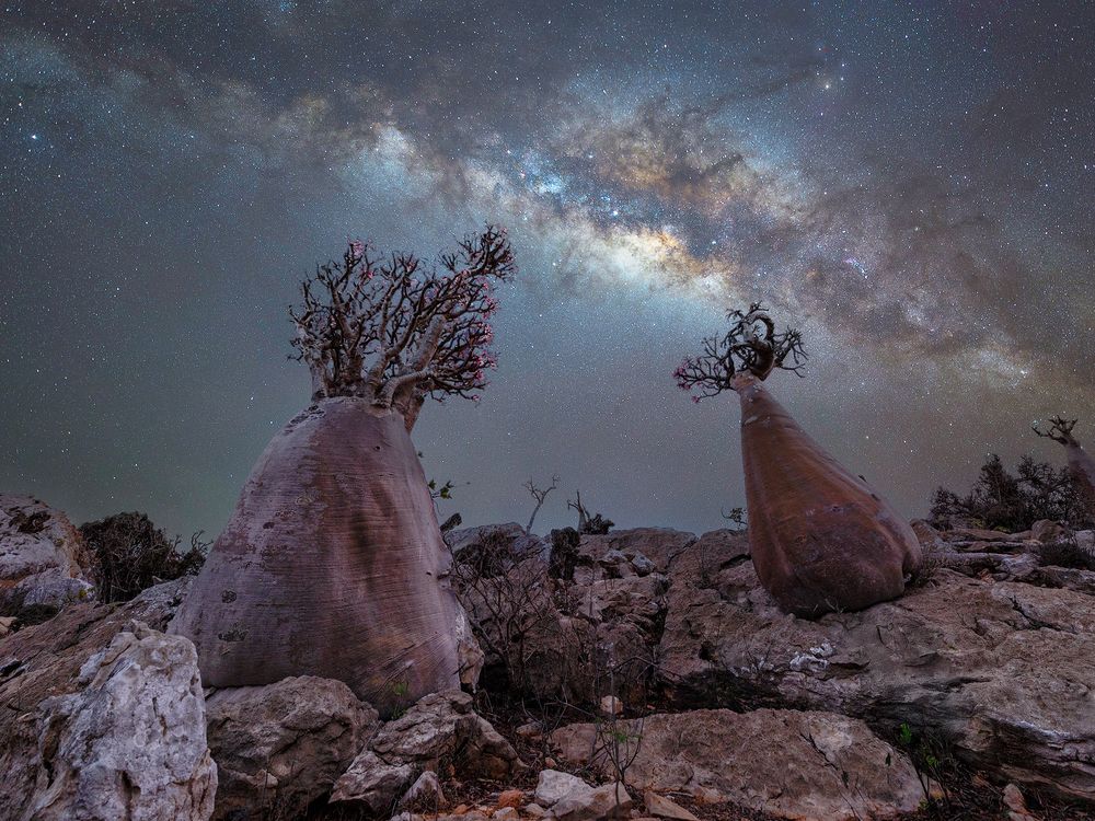 The bottle tree is endemic in Socotra, Yemen. It grows in a rocky arid landscape and stores water in its trunk and has the strangest shapes! Socotra has an abundance of unique plants that can only be found on the island due to a short rainy season and very long dry season and its location in the Indian Ocean between Africa and the Middle East. The nights in Socotra were super dark with the milky way very clear.