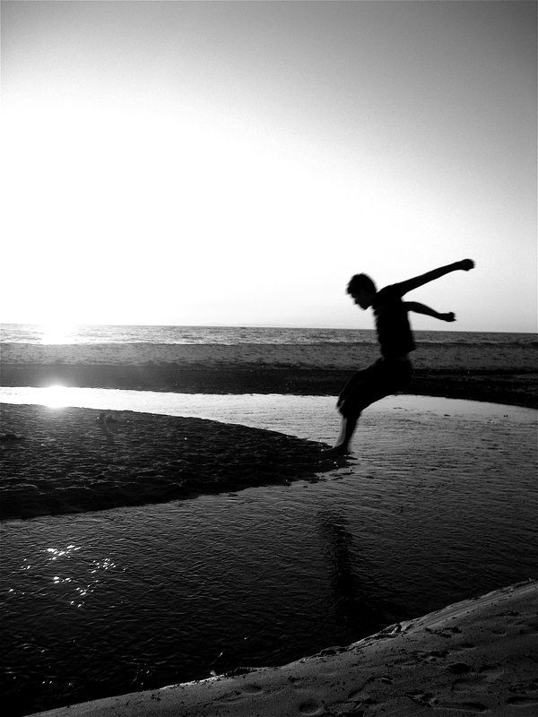 Boy jumping over beach-side creek