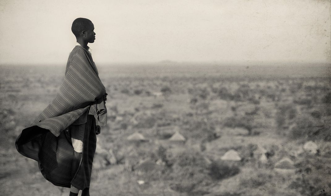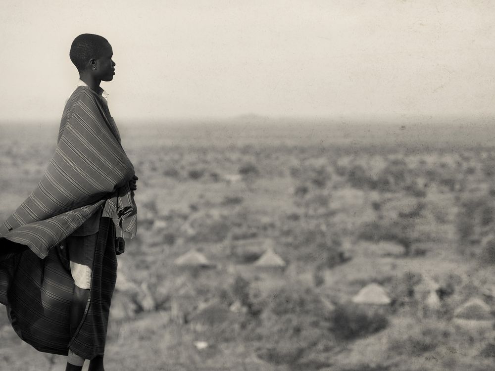 Boy overlooking his remote village in Karamoja, Uganda, Africa
