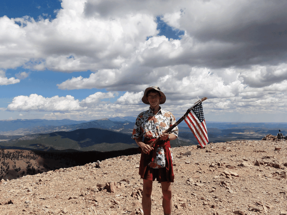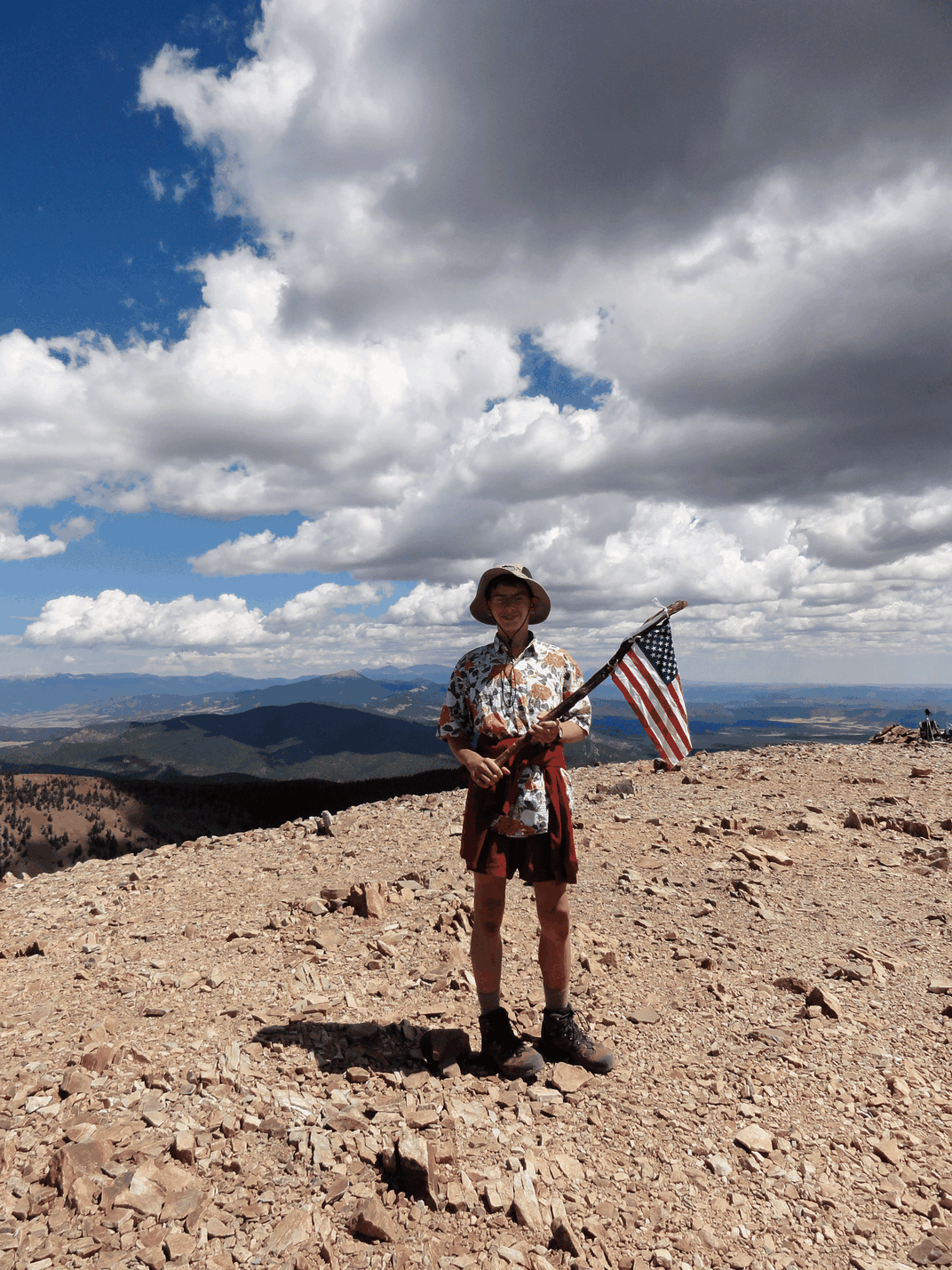 Boy scout displaying American flag on summit of Baldy Mountain at Philmont Scout Ranch near Cimarron, New Mexico