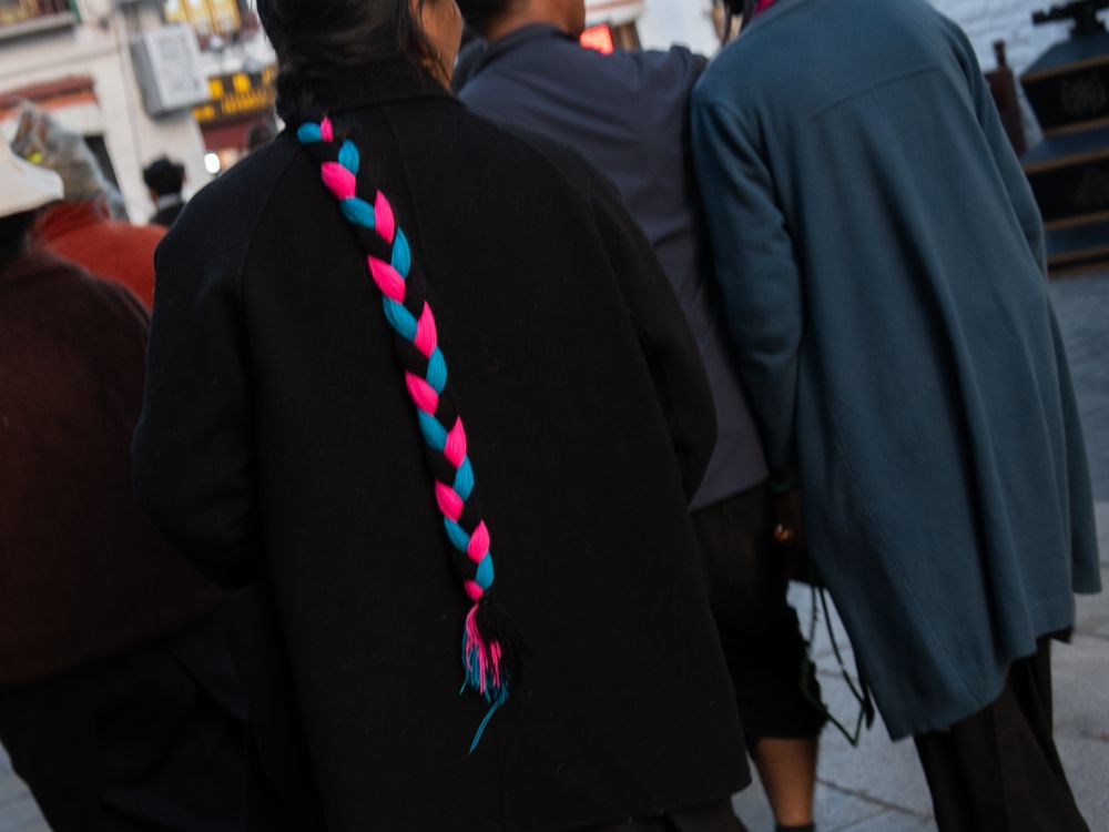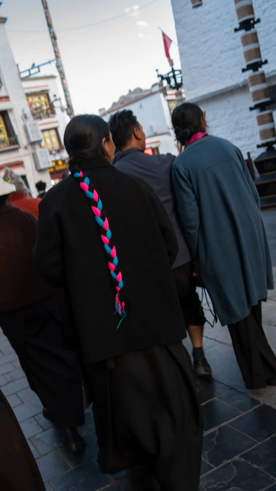In autumn in Lhasa, Tibetan pilgrims are circumambulating the Jokhang Temple on Barkhor Street, wearing traditional local braided hairstyles. At the same time, three other people on the right side of the road are distracted by (or looking towards) someone/something.