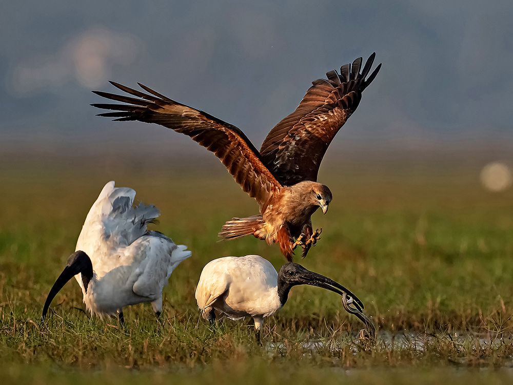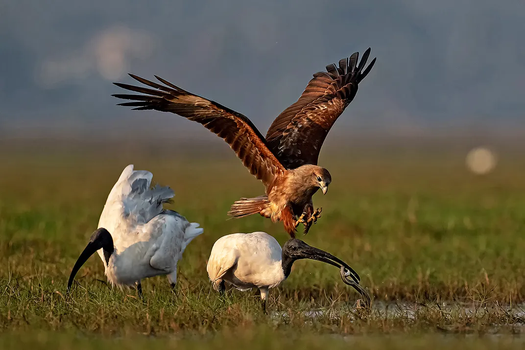 Ibis is a migratory bird. Every year they come to different parts of India.Mangalajori is a bird sanctuary, where millions of migratory birds visit at winter. These ibises spend their whole days hunting for food such as frogs , snakes etc from this wetlands. At that very moment, the Brahminy Kite snatches the food and runs away.