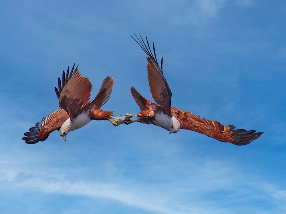 There are brahminy kites in the region around the Strait of Malacca. When one catches a fish another often tries to steal it and that was captured in this image