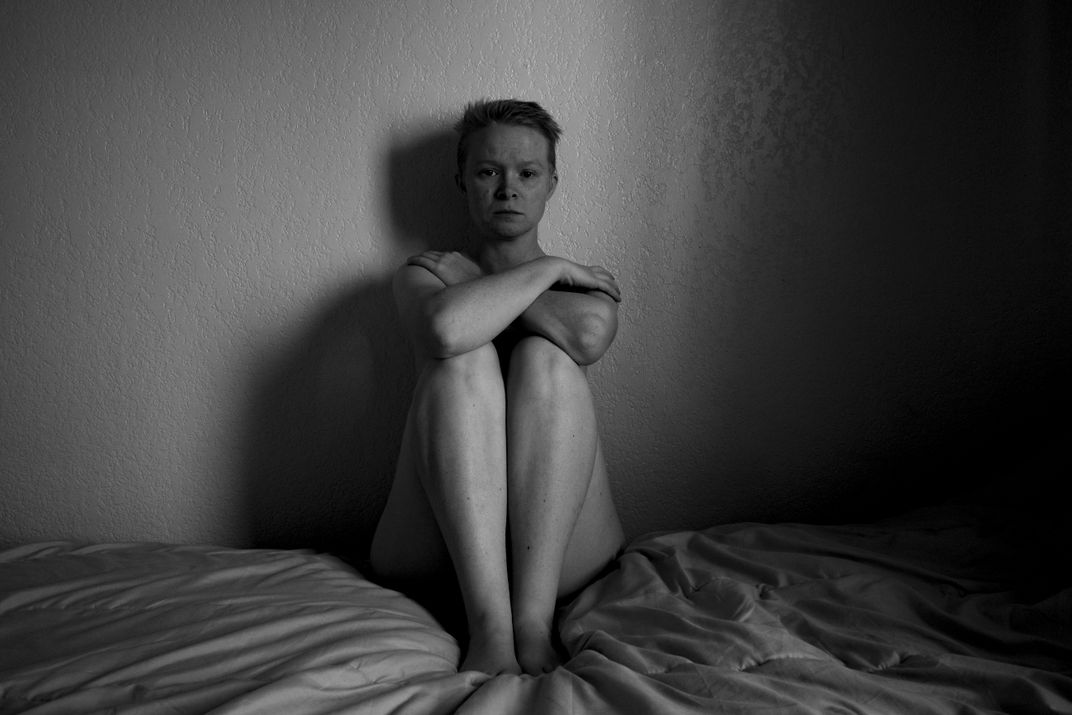 A woman sitting on her bed. She is not clothed and yet exposes nothing.