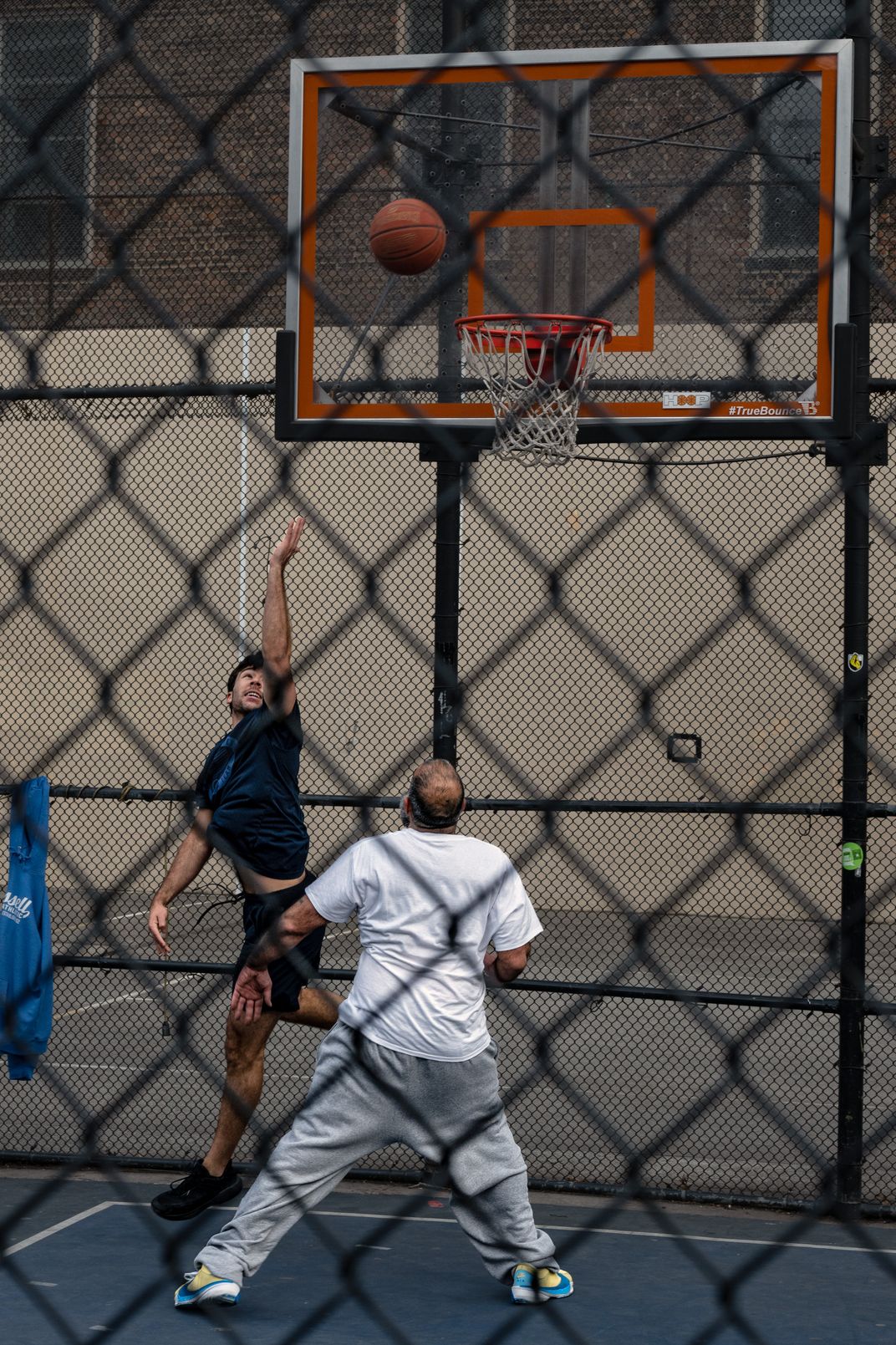 This is a public basketball ground. Two men were playing basketball. They were fighting each other. A man snatched the ball and shot.