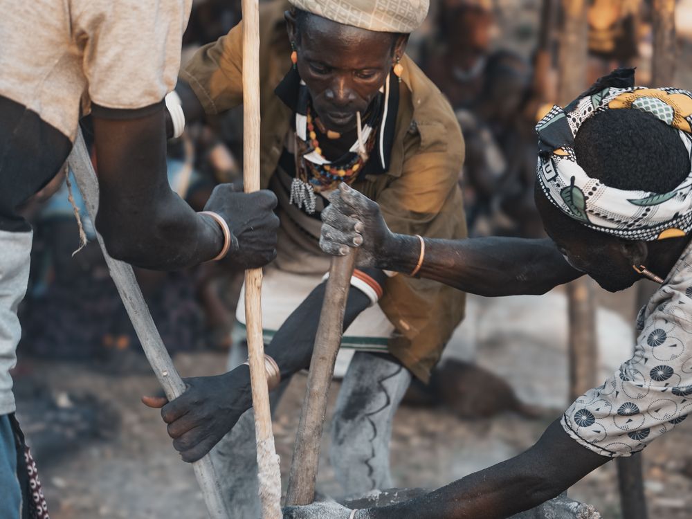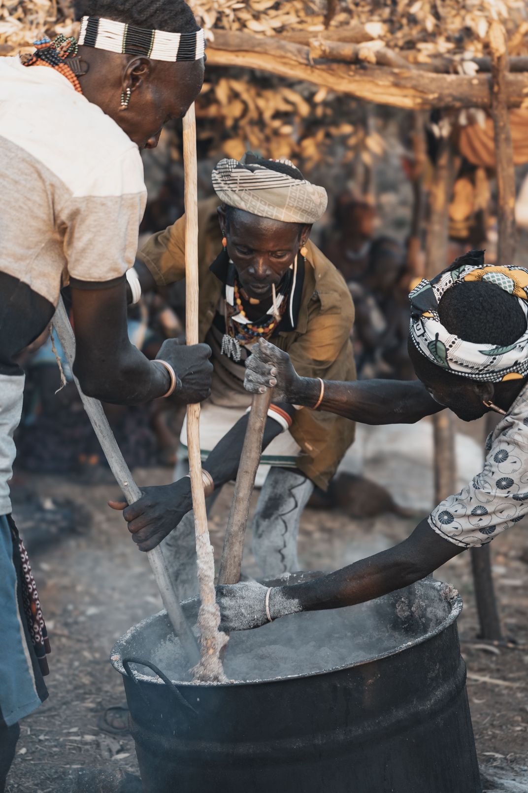 During preparations for the bull-jumping rite, the elders stir a traditional coffee brew over an open fire. Its aroma gathers the community, marking the transition from everyday life to the charged atmosphere of an initiation ritual.