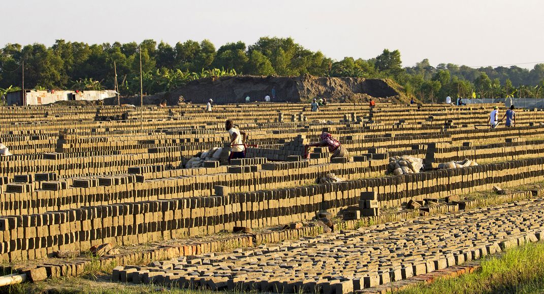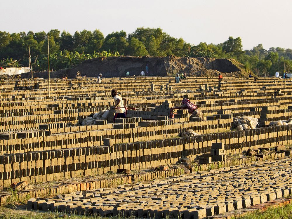 Brick field workers carry raw, wet mud bricks and arrange them in open areas or specific drying chambers to dry in the sun and air before they are fired