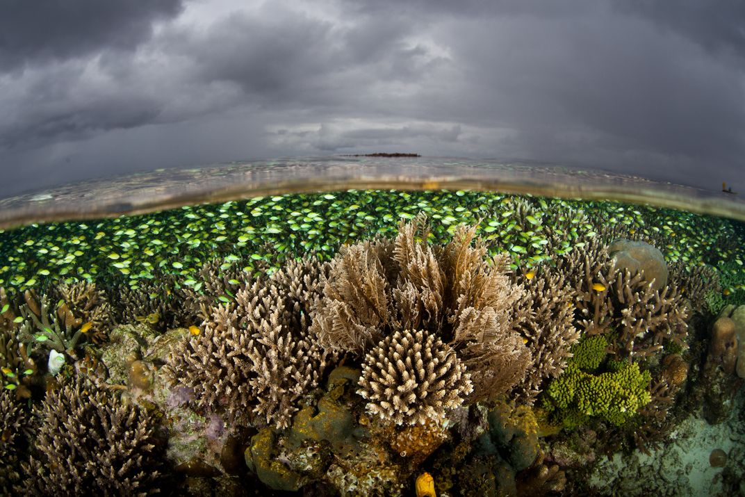 Bright Blue-green damselfish swarm over a shallow coral reef in a remote area of eastern Indonesia. This region harbors some of the most diverse marine habitats on Earth.