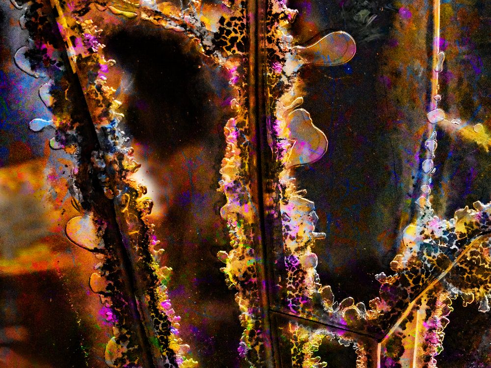 Broken glass in an old car, in a junkyard. The junkyard specializes in antique/classic cars. I scoured the junkyard looking for shapes that would lend themselves to being composited with other images.