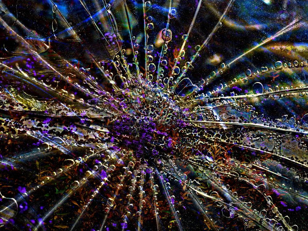 The base layer photo is of broken glass in an old car. That photo was layered (composited) using some of my other photos from different locations. Specifically, the purples come from fall colors in my area and the background shapes come from seaweed along the Oregon coast.