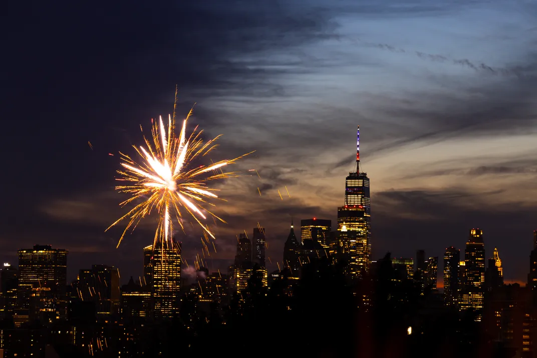 View from Brooklyn rooftop on July 4th - An amber burst of fireworks against the city skyline at dusk. Many locals in Brooklyn set off fireworks before and during the official NYC fireworks show.