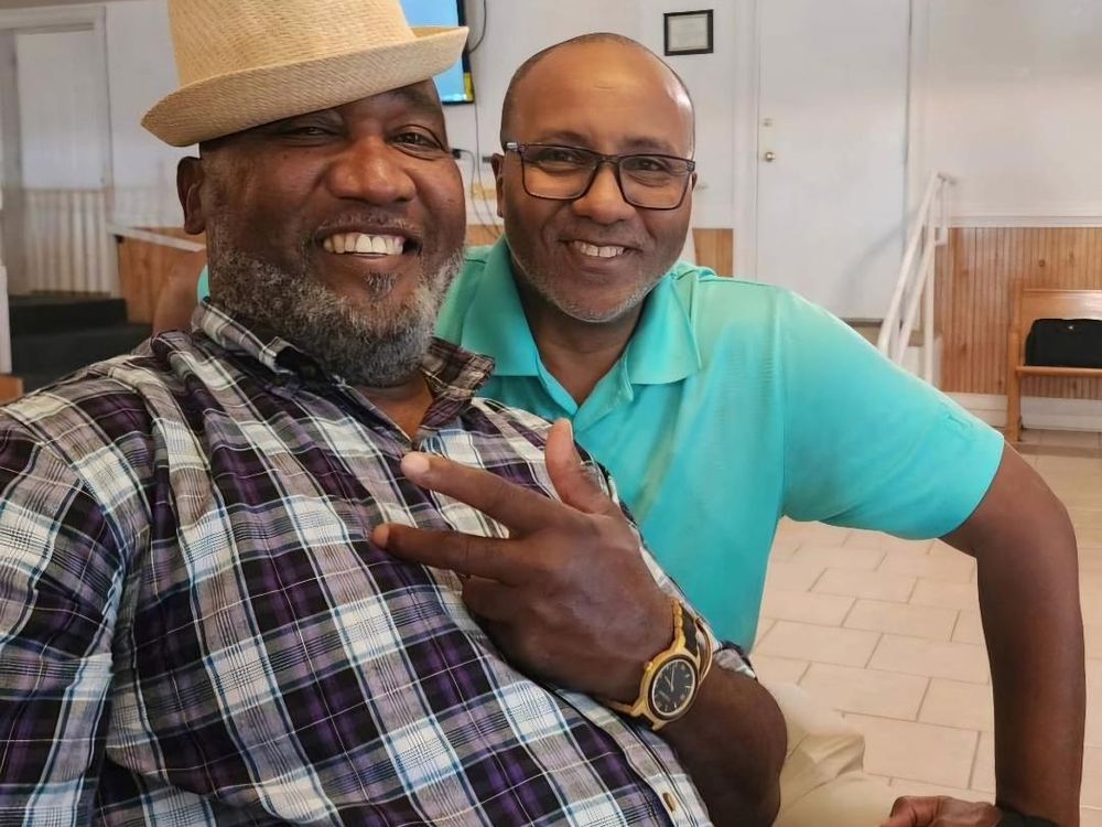 Brother-in-Laws sharing a laugh at their mother/mother-in-law's 90th birthday part
