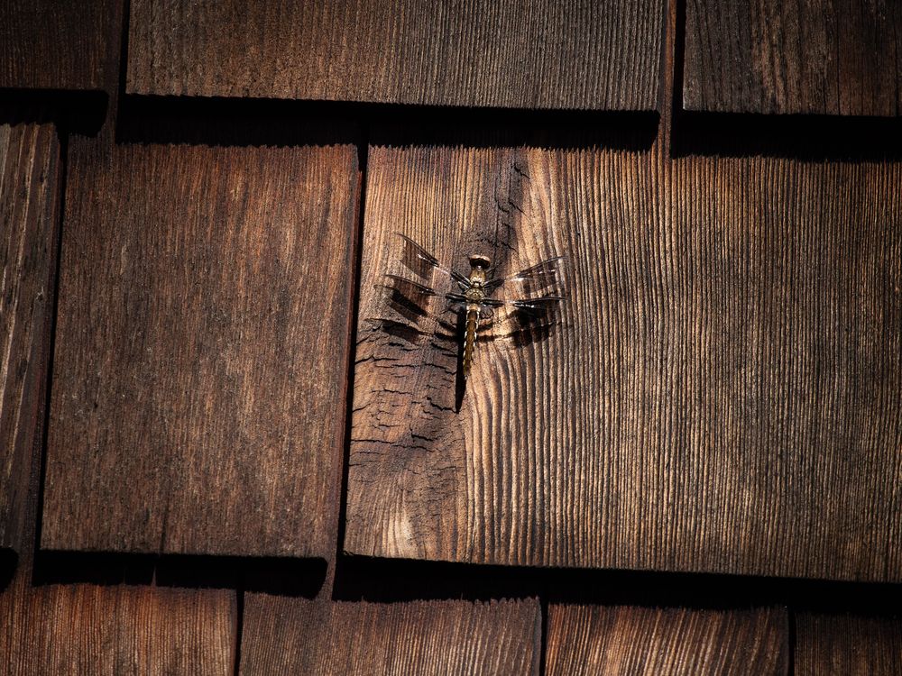 It is a young male common whitetail on a cedar shingle wall. When they are older, the tail turns white.