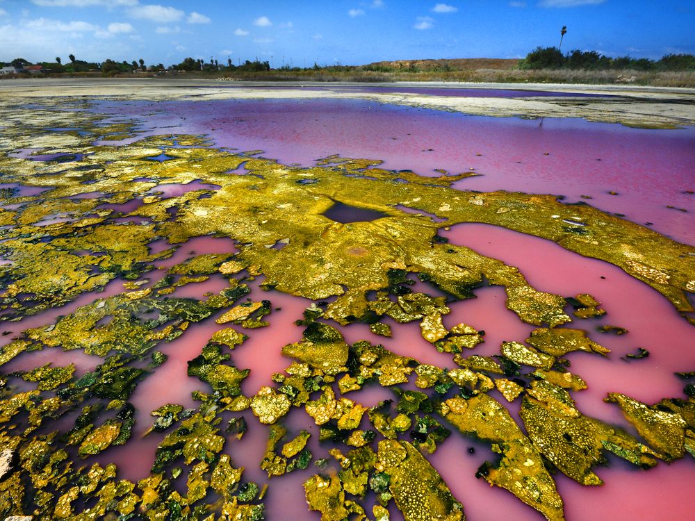 Fish pond Which have removed the water from it What was left was covered with yellow and green moss and the water painted pink because of bacteria