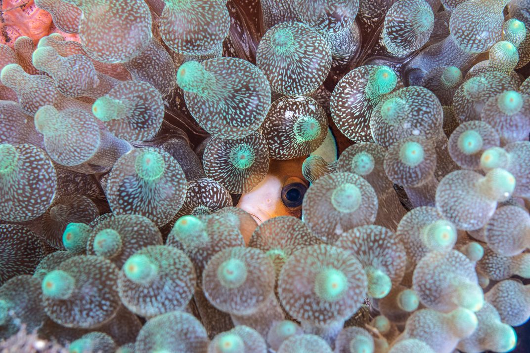 Clownfish are perhaps the most photogenic species in the oceans. They are irresistible in their often bold attitude, with constant attacks and retreats under the protection of their anemone. Infinite are the scenes that can be presented together with the variety of anemones in which they live, often beautiful, like this bubble anamone, where a small shy eye peeps out from among the branches.
