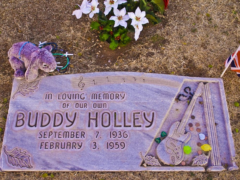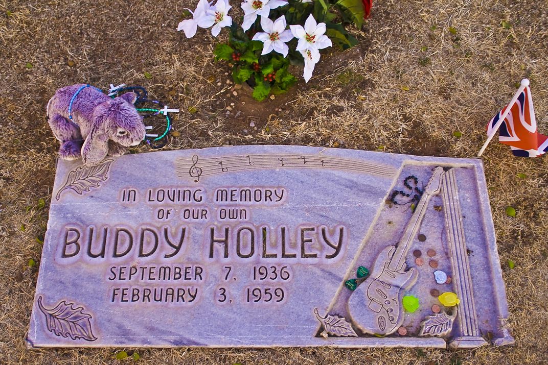 Buddy Holly's gravesite, where fans leave flowers, coins, guitar picks, etc.