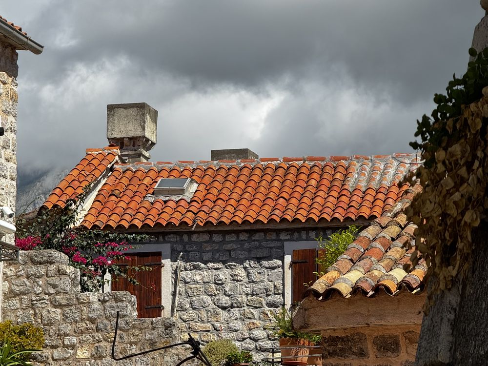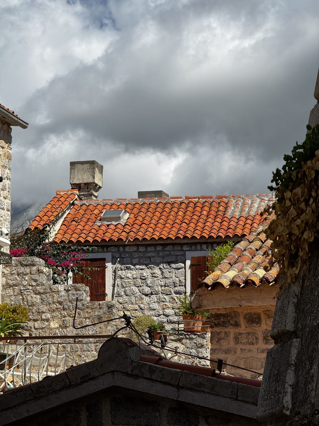 Historic stone walls and vibrant terracotta roofs define Budva's charming old town, bathed in sunlight under a dramatic, cloudy sky. Bougainvillea blooms add a touch of color to this timeless Mediterranean vista.
