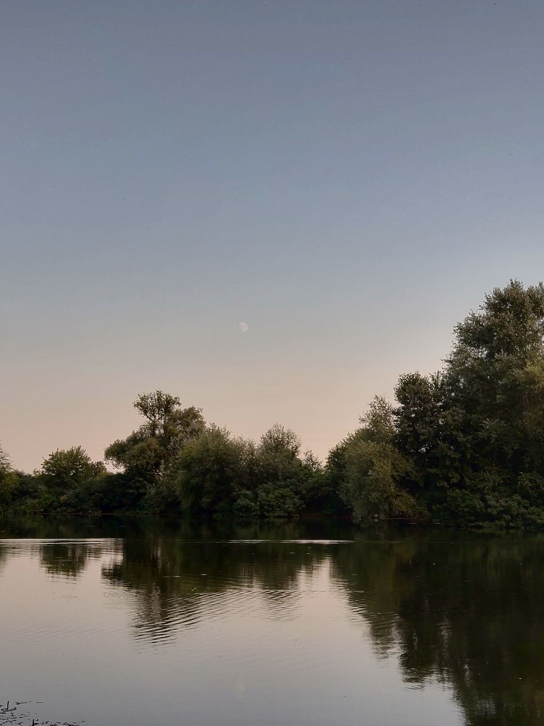A pale moon shines over a serene kettle lake in Bulgaria