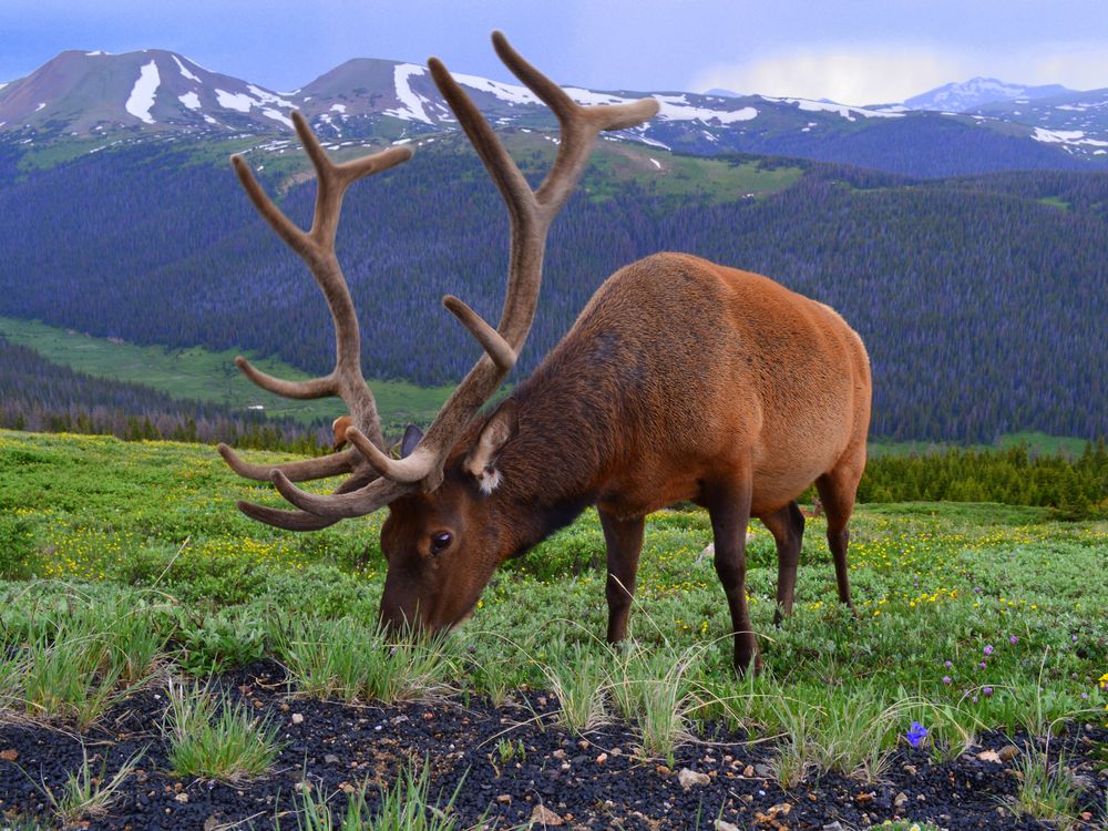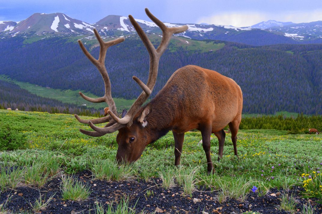 This is a bull elk in view from Trail Ridge Road in Rocky Mountain National Park. He was in a herd of about 8 other bulls that were grazing on the wildflowers. This was taken a short distance west of the Alpine Visitor's Center.