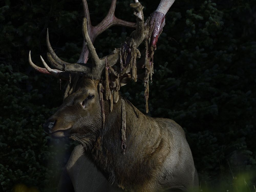 A bull elk is shedding the velvet on its antlers while in between sunlight and shade.