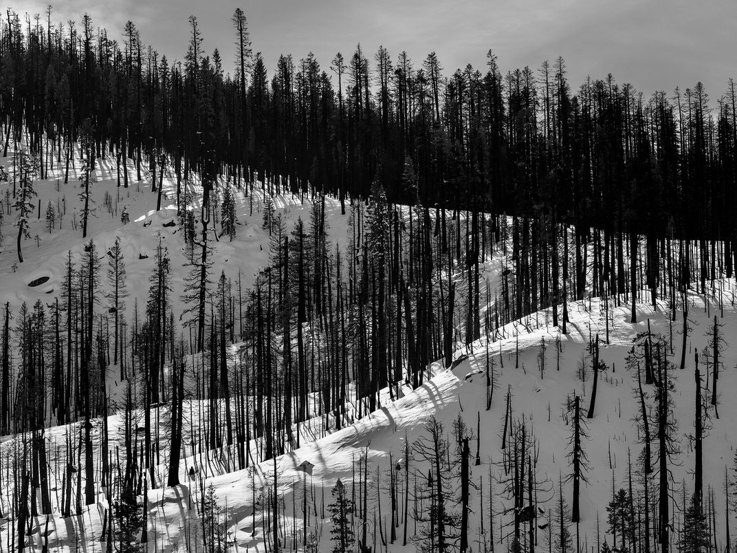 Black and white of a death and burned pine tree caused by the Caldor fire at Echo Summit, a mountain pass over the Sierra Nevada in the western United States, located in eastern El Dorado County, California. This photograph is from the collection of 30 large format images photographed the winter of 2021 following the fire and shows the aftermath of the Caldor Fire that burned over 221,835 acres (89,773 hectares) of forest as far as the eyes can see. The Caldor fire also destroyed 1,003 structures and damaged 81 more, primarily in the US Highway 50 corridor and in the community of Grizzly Flats, 2/3 of which was destroyed by the fire in the State of California, Lake Tahoe- Sierra Nevada region. The Basin is home to a large number of pine and fir tree species including the Jeffrey pine, Lodgepole Pine, Sugar pine, Ponderosa pine and the Western White pine.