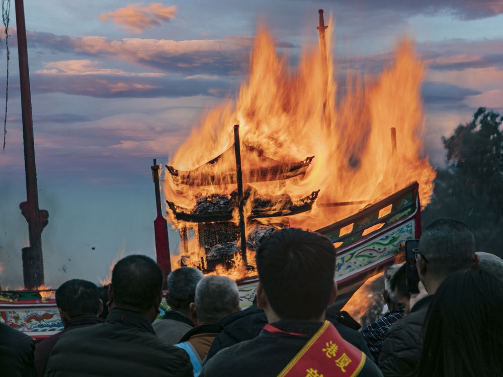 The carved and painted boat is engulfed in flames, warm orange waves rolling with festive energy. Silhouettes of people stand nearby, and even camera lenses capture the solemn yet intense ritual. It is as if wishes for the past year are burned into the sky filled with sunset and fire, every flicker infused with rural devotion.