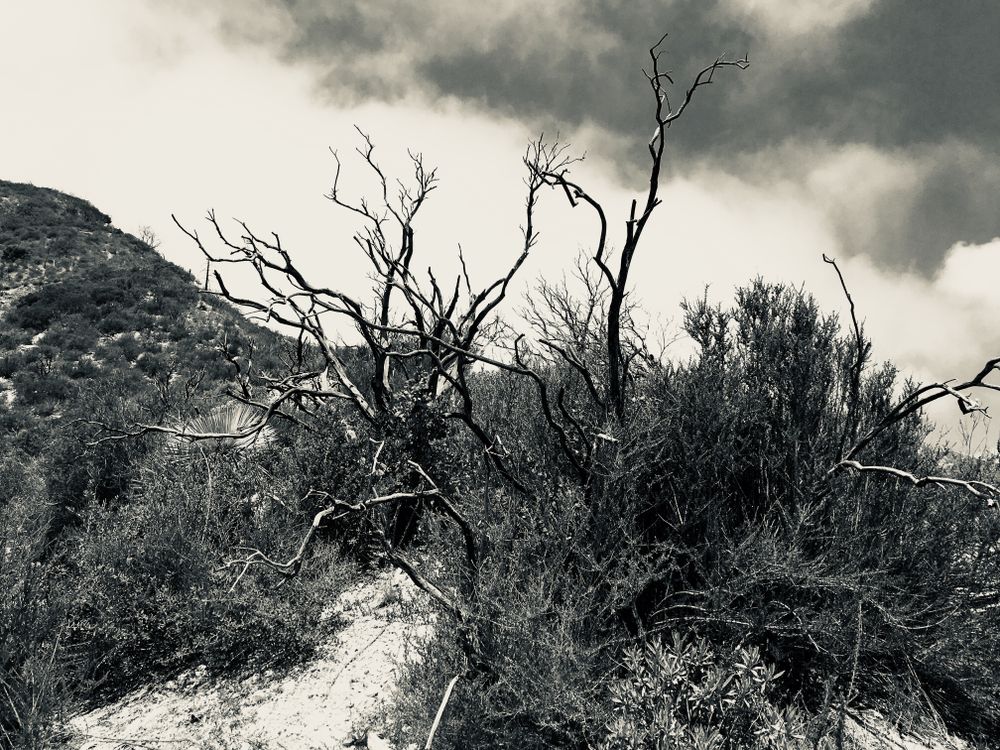 A burnt bush up on a trail at Switzer Falls in the Angeles Forest. The forest is in a constant cycle of death and renewal. The annual fires devastate the landscape, leaving behind blackened remains of shrubs and trees among verdant new growth. These burnt offerings bear witness that like you, they were once alive, and that like you will one day be, they are now relics of what they once were.