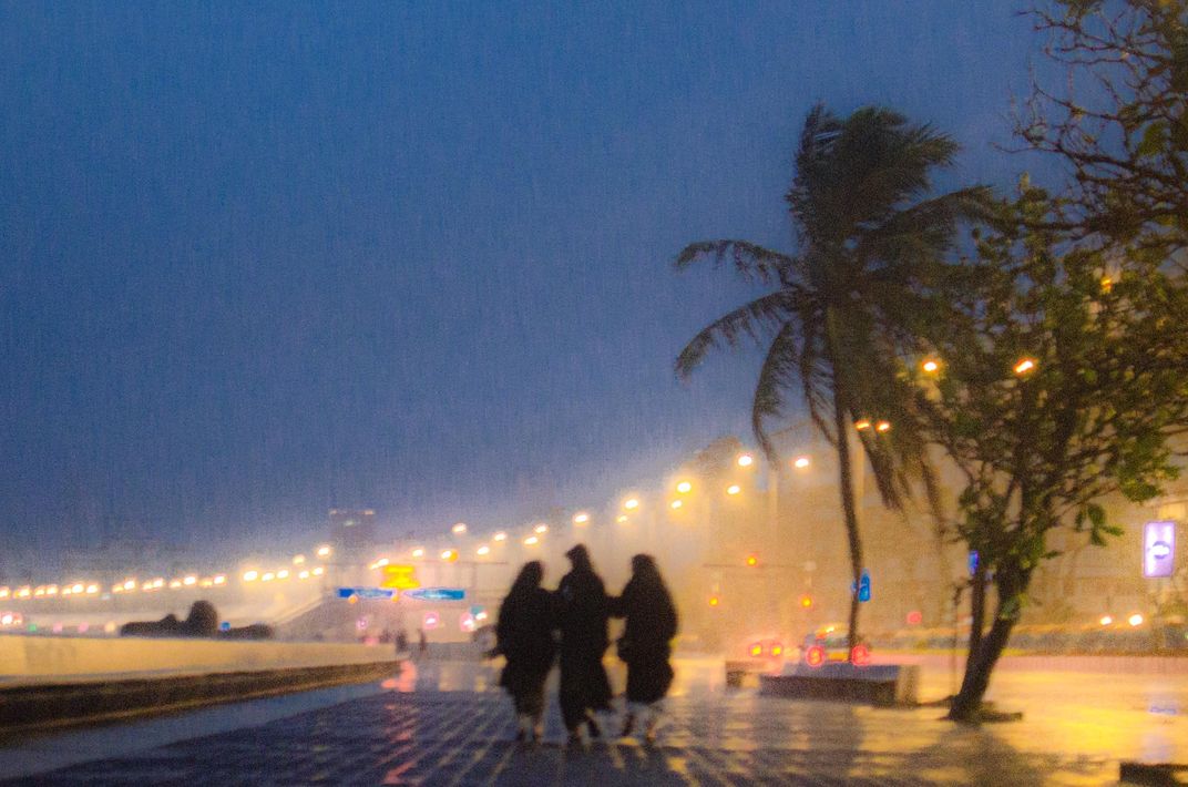 Three friends in black burqas walk down Marine Drive in a pounding monsoon downpour, leaning into the wind as palm trees whip beside them. The image celebrates quiet resilience and companionship in the face of the city’s wild seasonal weather. The burqua - the black cloak like dress traditional muslim women wear, is often painted as repressive and sign of a regressive society, however, I have observed these three friends sit, chat and stroll on marine drive every saturday right through the monsoons showing camaraderie, freedom and symbolising freedom.
