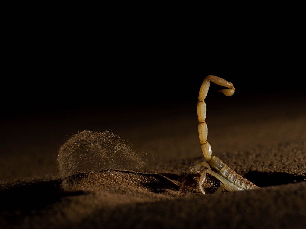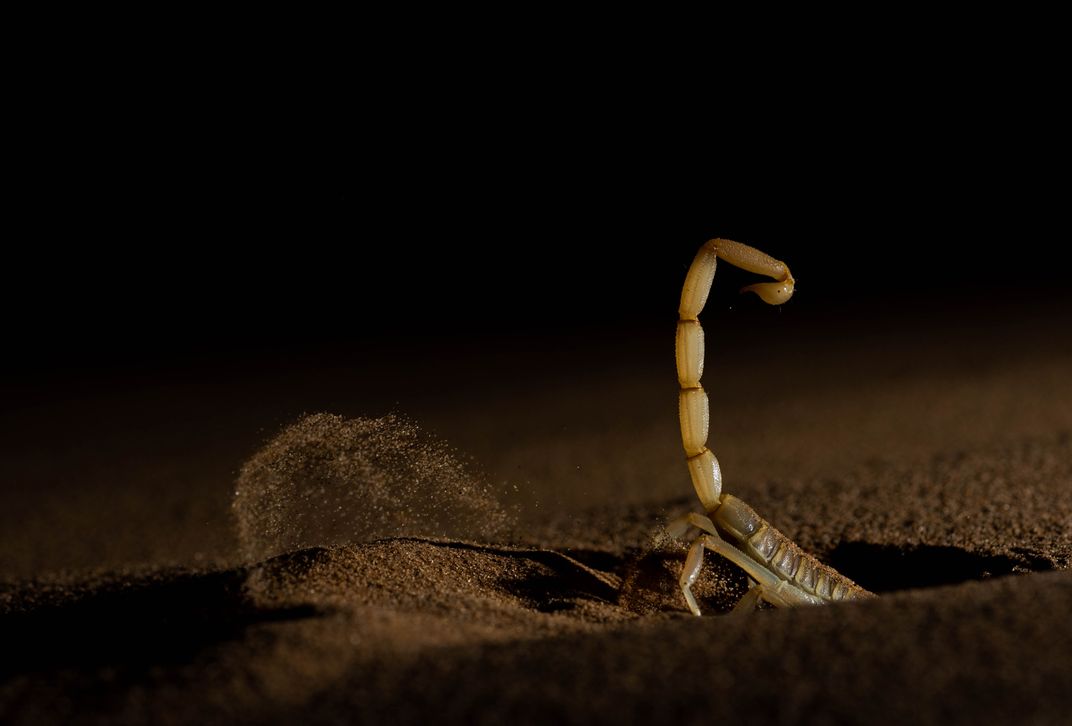 A scorpion burrows in a desert habitat.