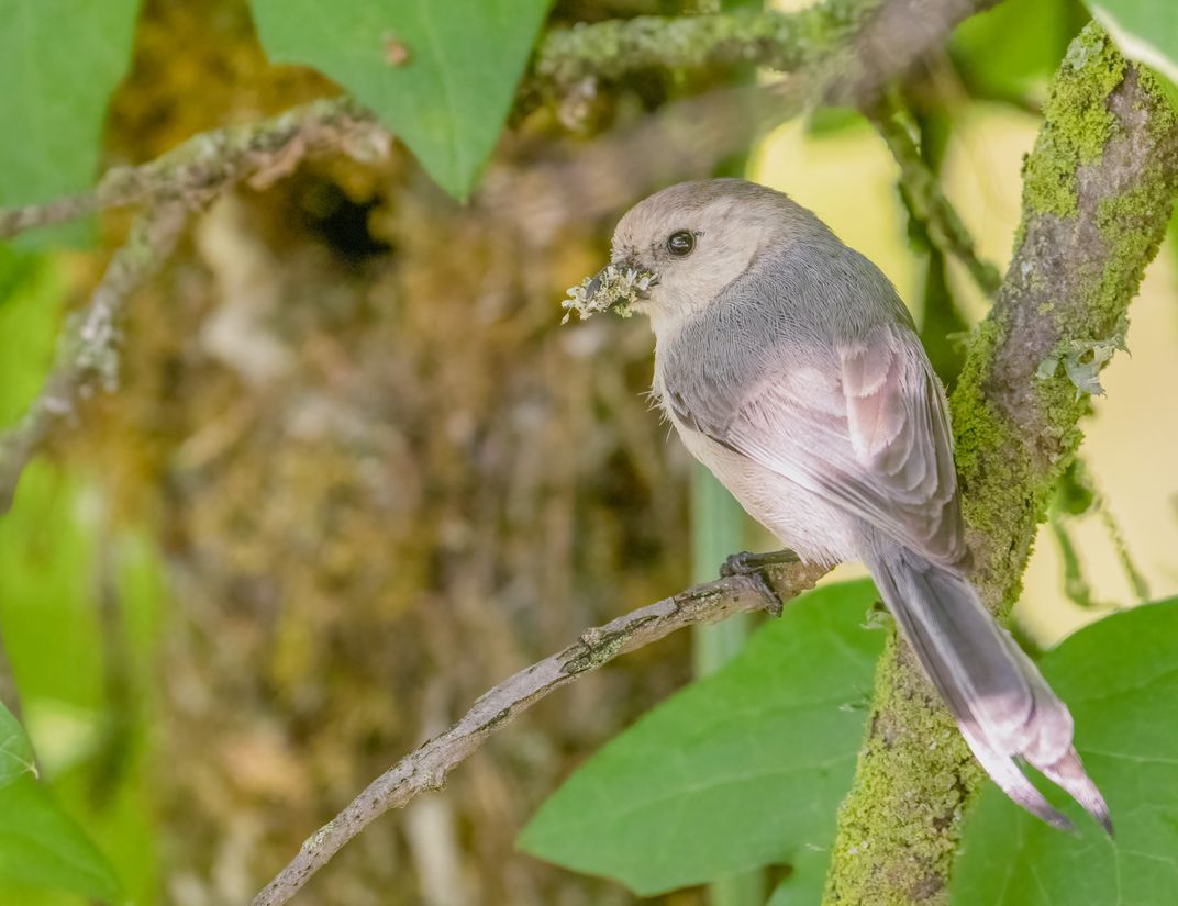 A Bushtit pauses outside its nest before entering with a "bouquet" that could be food, material for nest enhancement or, as I like to think, a gift for its mate.