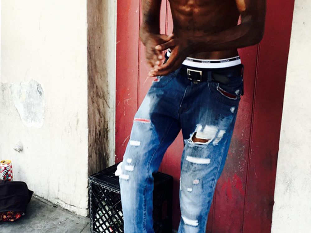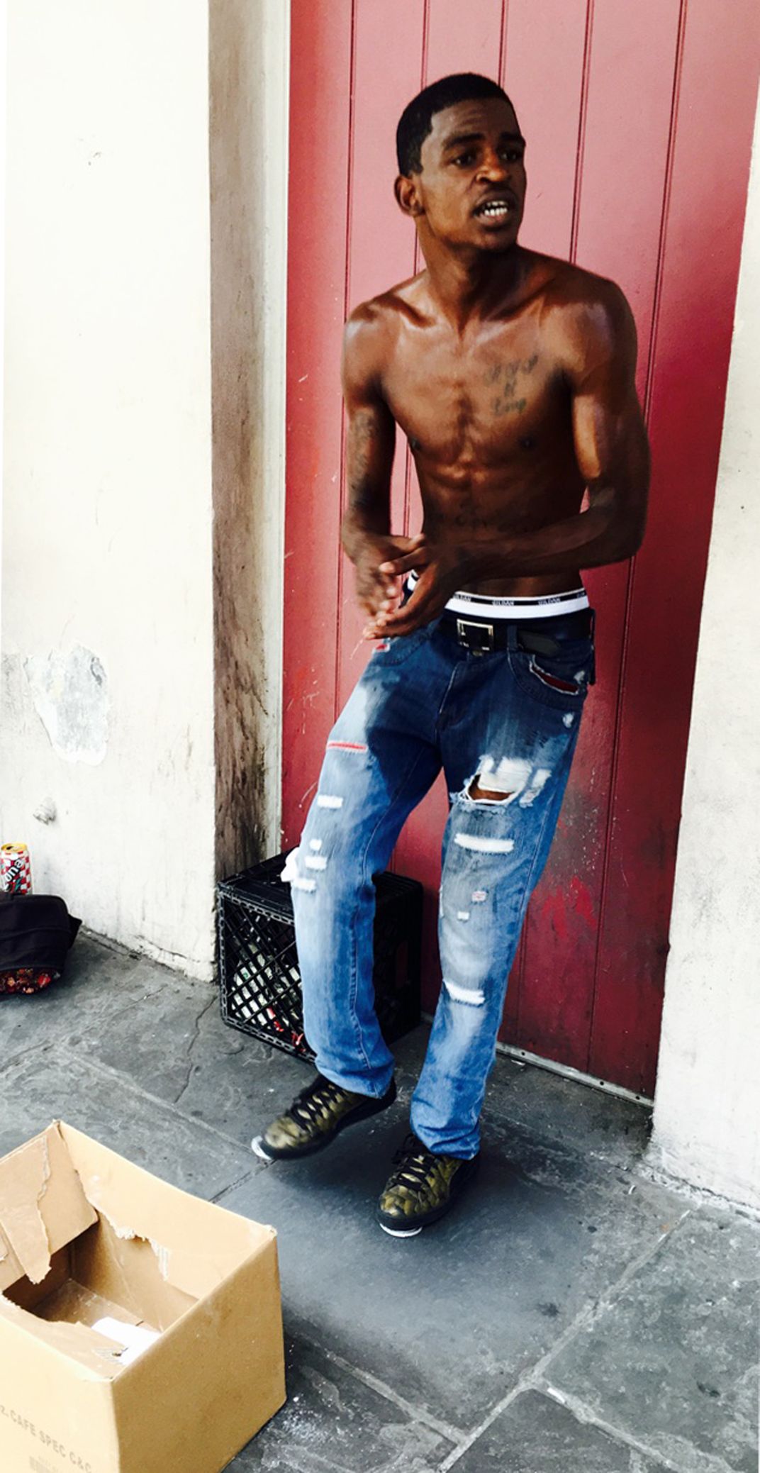Street tap dancer with bottle cap taps on his sneakers, entertains passersby on hot day in New Orleans